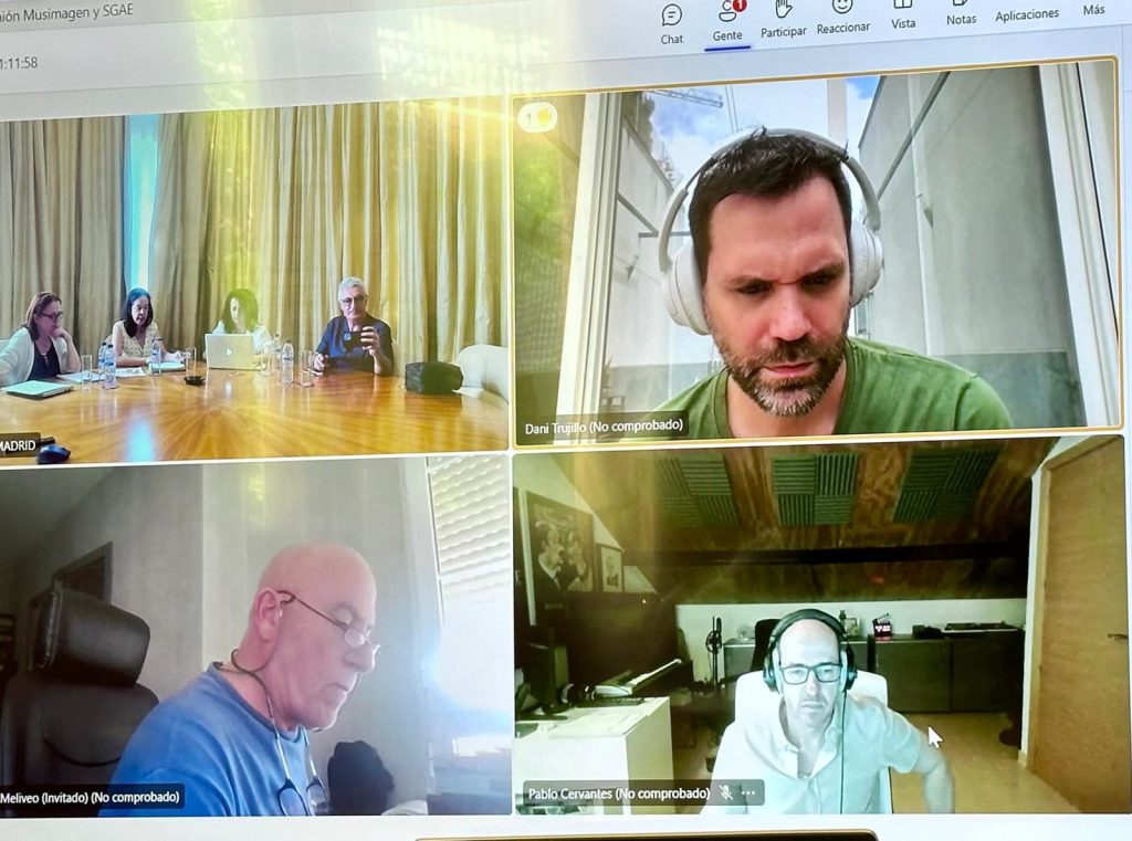 El pasado 17 de julio tuvo lugar una reunión entre Musimagen y SGAE en la que participaron Cristina Perpiñá (Directora General de SGAE), Teresa Cid (Directora de Operaciones de SGAE), Ana Vázquez Silva (Presidenta de Musimagen) y Luis Ivars (Vocal de la Junta Directiva de Musimagen) de forma presencial, en la sede de Madrid de la Sociedad de Autores y, online, Antonio Meliveo (Vocal de la Junta Directiva de Musimagen), Dani Trujillo (Vocal de la Junta Directiva de Musimagen) y Pablo Cervantes (Miembro de Musimagen y del grupo de trabajo Relaciones Musimagen-SGAE).